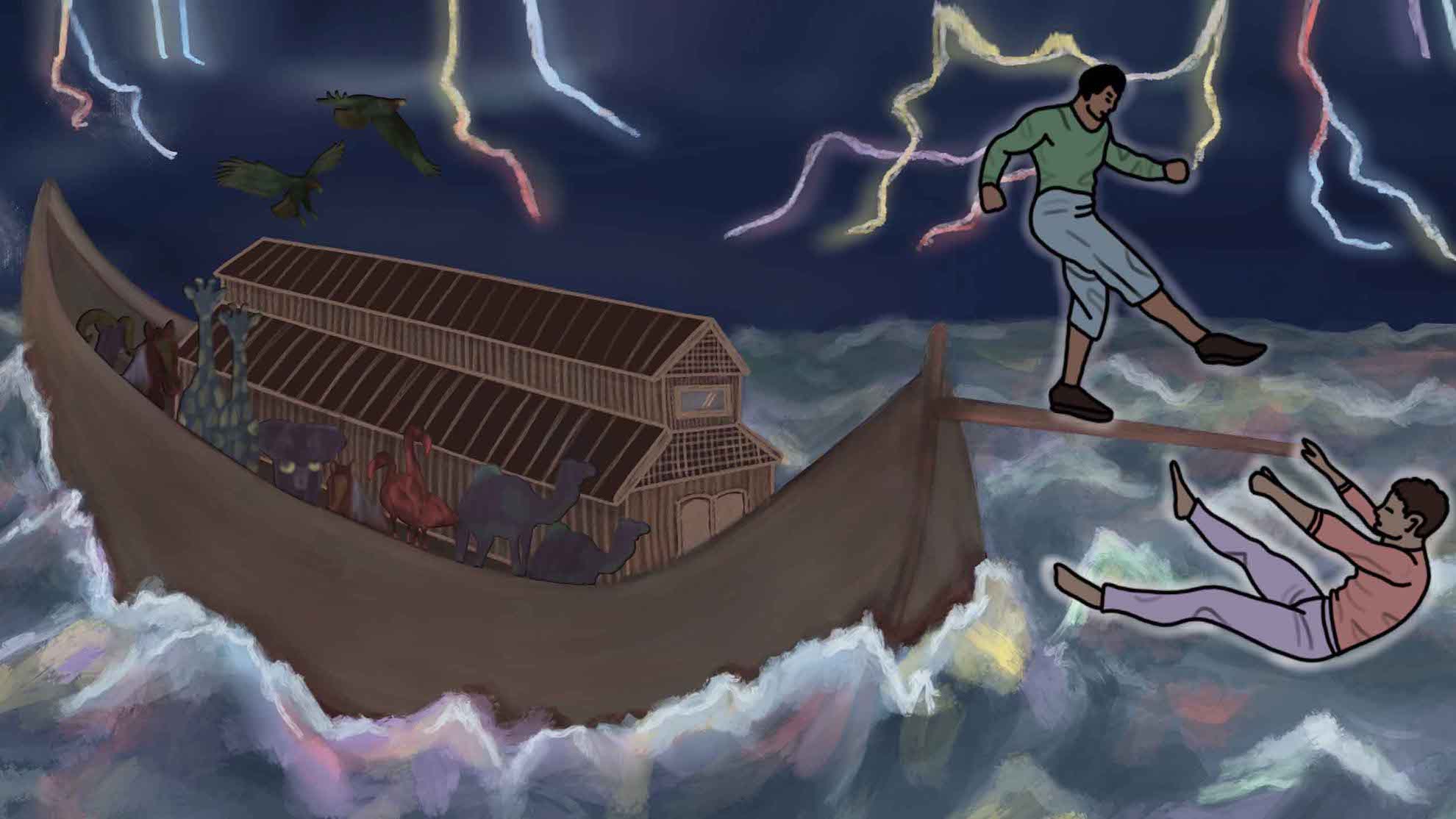 Then, God described how, out of nowhere, Noah showed up with his family, asking when he could get on. The